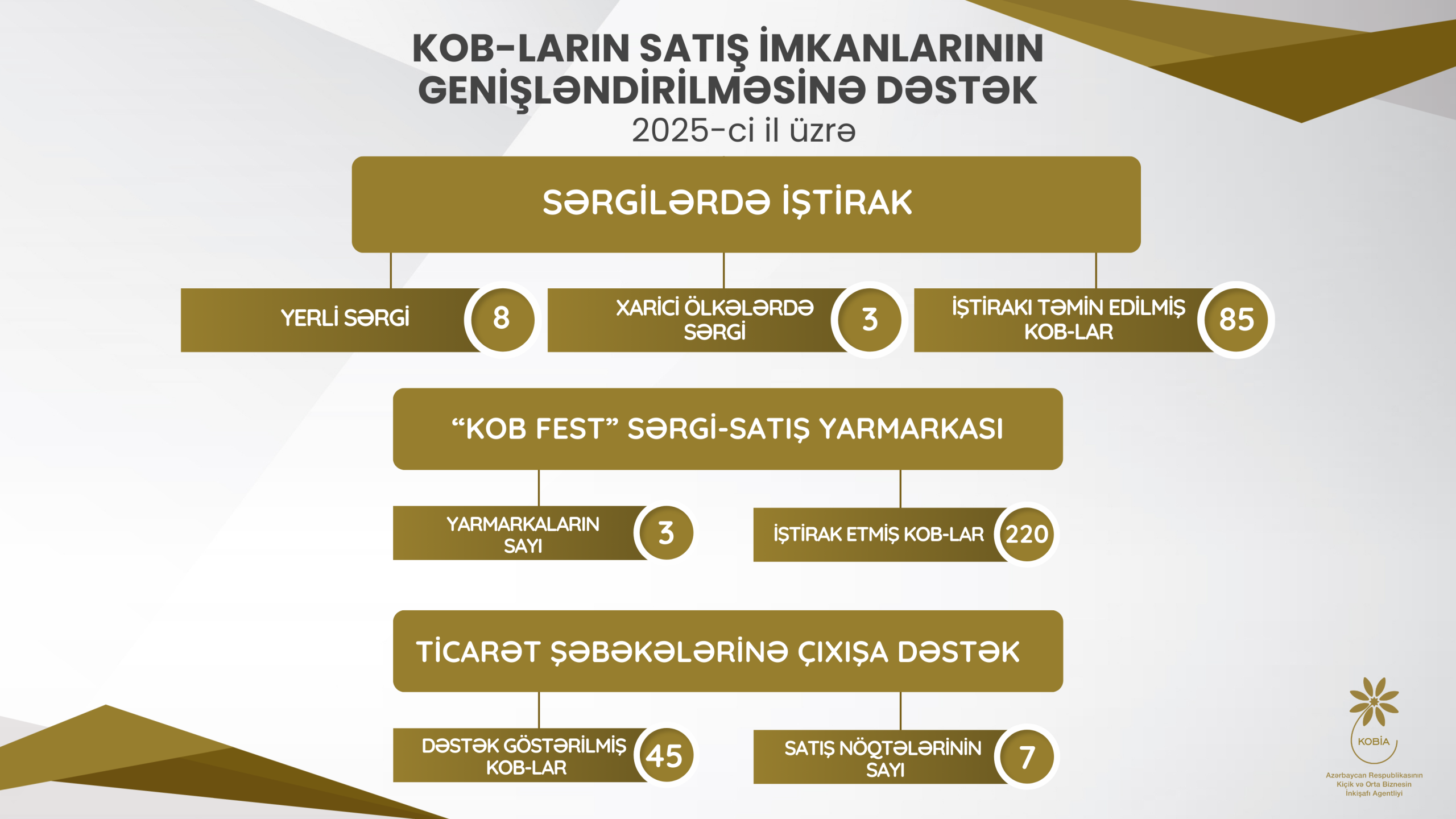 Globalart.az “KOBIA”ya istinadən xəbər verir ki, Kiçik və Orta Biznesin İnkişafı Agentliyi (KOBİA) tərəfindən təmin edilən KOB subyektlərinin satış imkanlarının genişləndirilməsinə dəstək mexanizmlərindən 2025-ci ildə 350 mikro, kiçik və orta biznes subyekti yararlanıb. Belə ki, 85 KOB subyektinin Azərbaycanda və xarici ölkələrdə keçirilən 11 sərgidə (8-i yerli və 3-ü xarici ölkələrdə olmaqla) ödənişsiz olaraq iştirakı təmin edilib. Mikro və kiçik sahibkarların istehsal etdiyi məhsul və xidmətlərin tanıdılması və satışına dəstək məqsədilə 3 “KOB Fest” sərgi-satış yarmarkası keçirilib. Göygöl, Şuşa və Göyçayda təşkil edilmiş yarmarkalarda 220 sahibkar məhsul və xidmətlərini təqdim edib və satışını həyata keçirib.