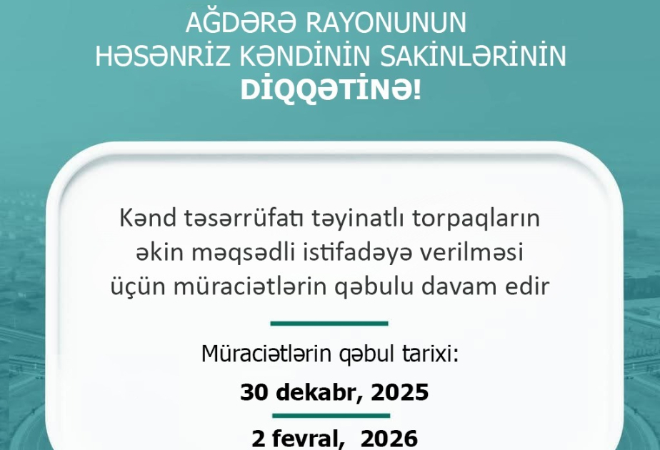 Dekabrın 30-dan başlayaraq Ağdərə rayonunun Həsənriz kəndi üzrə kənd təsərrüfatı təyinatlı torpaqların əkin məqsədli istifadəyə verilməsi üçün Elektron Kənd Təsərrüfatı İnformasiya Sistemi (EKTİS) – eagro.az saytı vasitəsilə müraciətlərin qəbulu davam edir.
