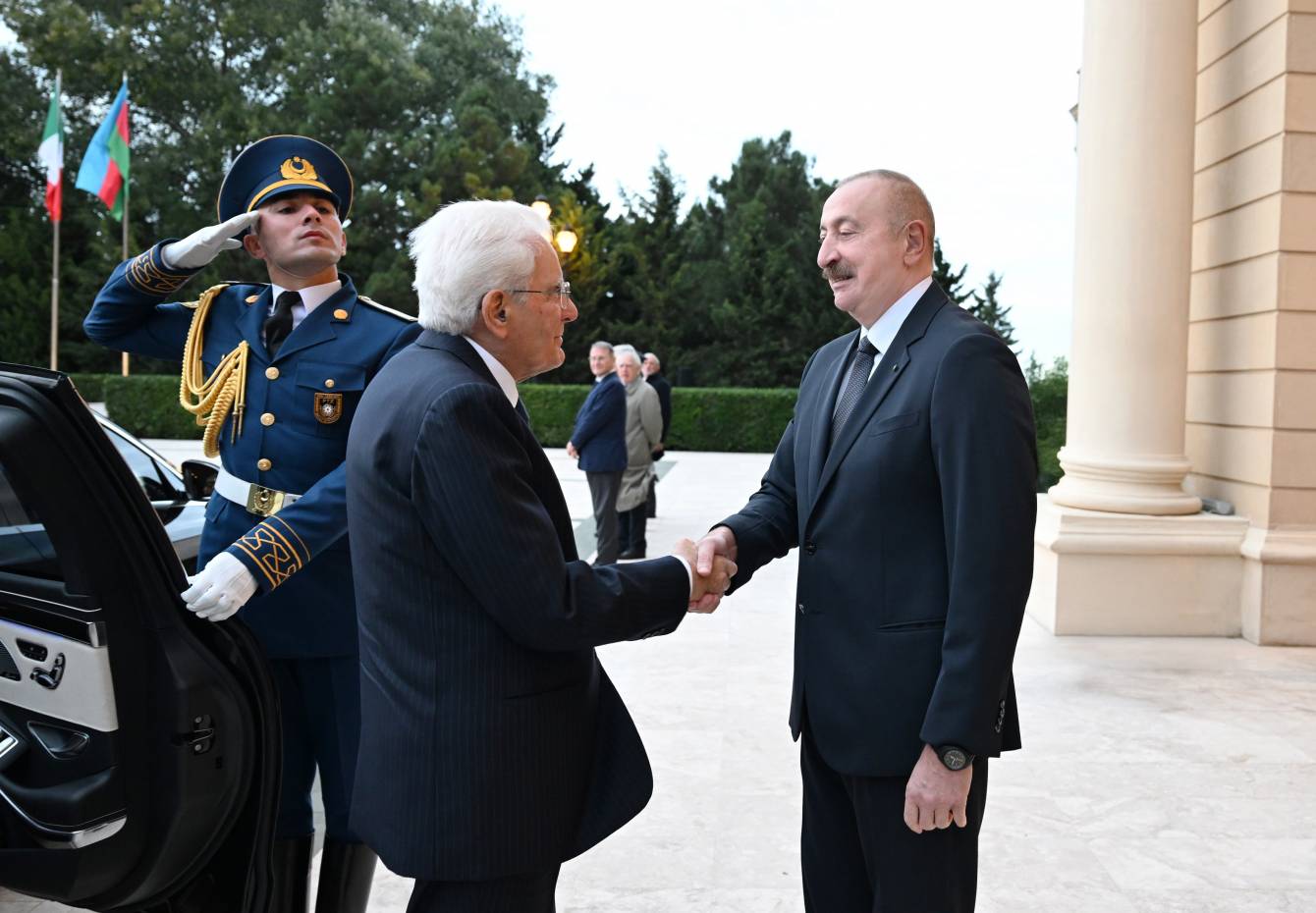 Hər iki ölkənin Dövlət bayraqlarının dalğalandığı meydanda İtaliya Prezidentinin şərəfinə fəxri qarovul dəstəsi düzülmüşdü.