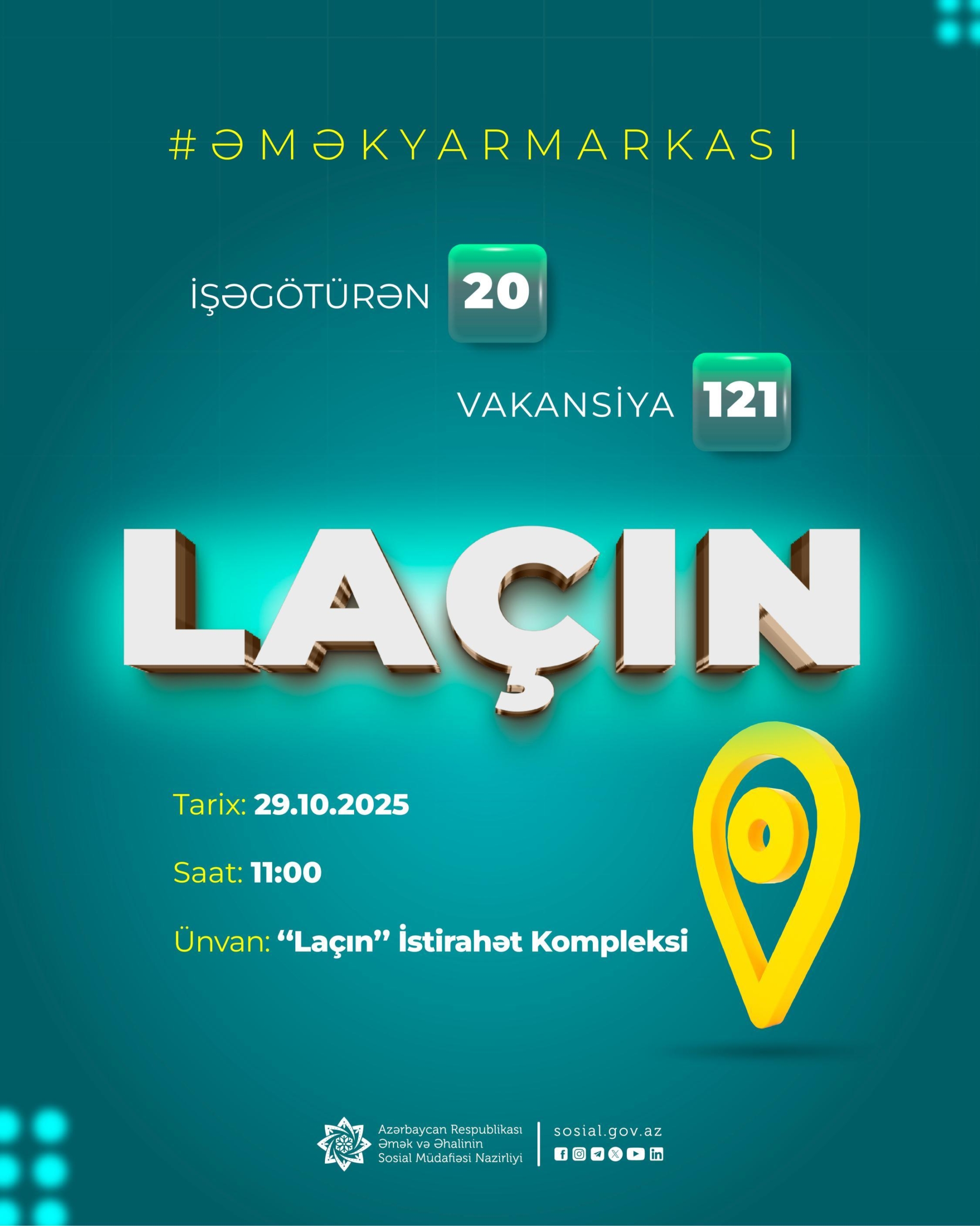 Globalart.az Əmək və Əhalinin Sosial Müdafiəsi Nazirliyinə istinadən xəbər verir ki, tədbir 29 oktyabr, 2025-ci il tarixində, saat 11:00-da Laçın şəhərində Azərbaycan Respublikası Prezidentinin İşlər İdarəsinin “Laçın” İstirahət Kompleksində təşkil olunacaq.